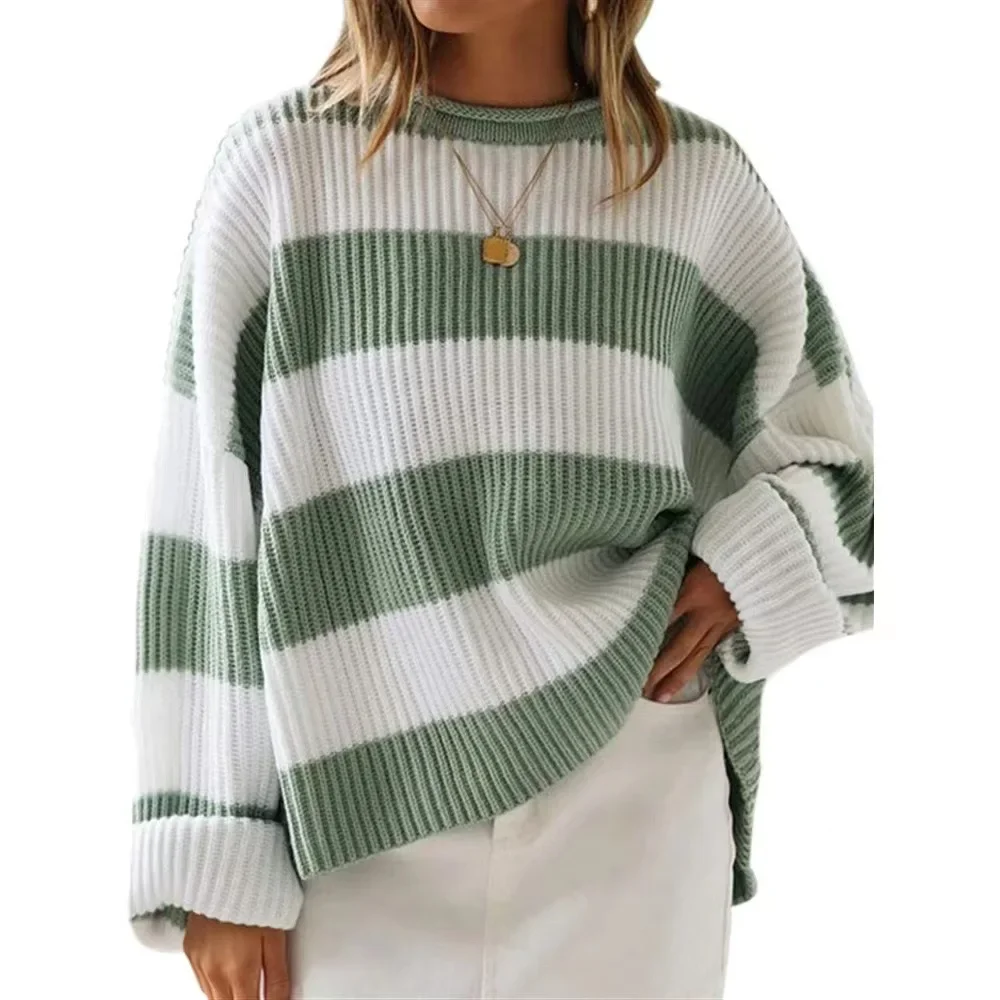 Autumn And Winter O Neck Long Sleeve Striped Sweater For Women Fashion Bell Sleeve Loose Knitted Sweaters Y2k Preppy style